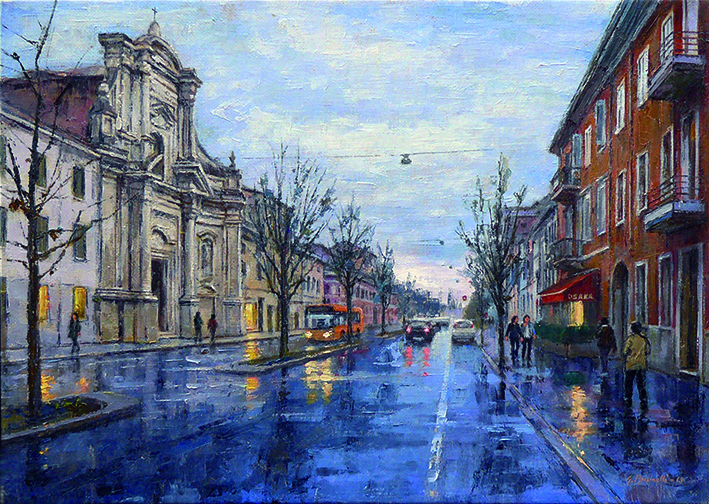 Mantova, l’acqua e la luce: sono questi gli elementi che Giancarlo Businelli mette al centro della sua ricerca nelle opere più recenti. È una città luminosa, con cieli azzurri solcati da nuvole leggere e che si rispecchiano nelle strade, nelle piazze e nelle pozzanghere create da fugaci temporali…