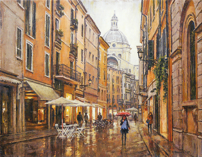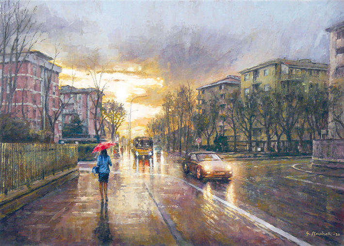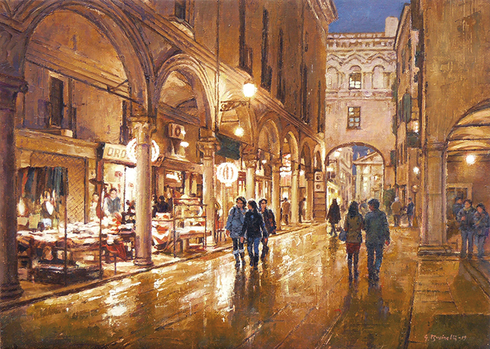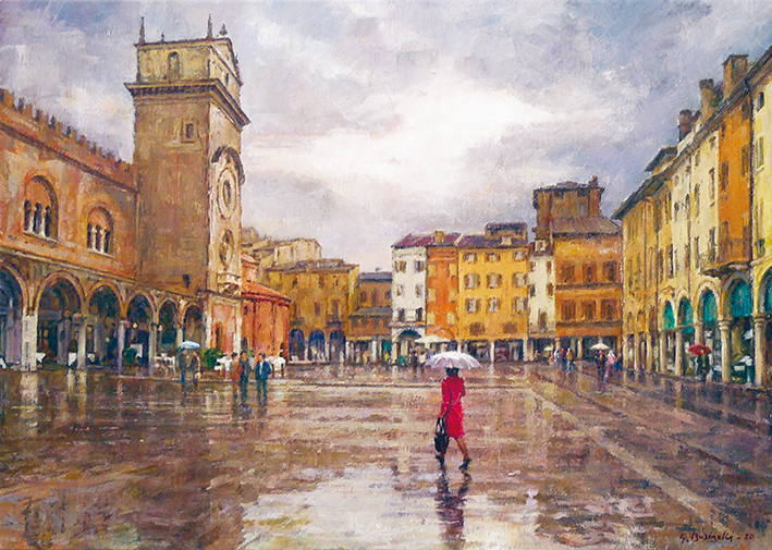 La pioggia mette spesso malinconia, eppure nei quadri di Giancarlo Businelli aggiunge un fascino tutto da scoprire. Il pittore ama giocare con i riflessi che l’acqua lascia su una piazza, una strada o in un parco. I colori ne escono rinvigoriti e una tavolozza calda e familiare comunica una Mantova tranquilla, dove la vita scorre con i ritmi del passato e le persone affollano le strade o rimangono sole attraversando una piazza.