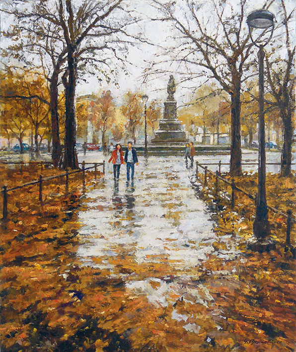 Forse per la prima volta il pittore dipinge una statua scegliendo quella solitaria di Garibaldi in piazza dei Mille. L’autunno ha riempito di foglie i giardini e Businelli descrive questo “foliage” con rapidi e decisi colpi di pennello. Anche qui è appena piovuto e il cielo sembra promettere altra pioggia ai due passanti, con le foglie che si aprono e affollano le aiuole delimitate da recinzioni in ferro che ricordano i parchi parigini.