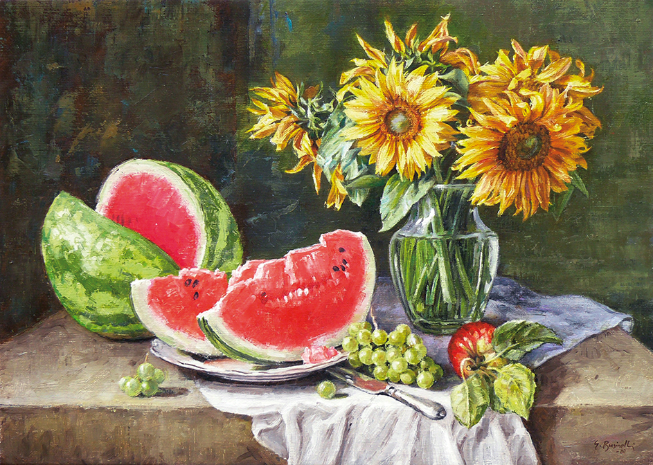 In questa mostra Giancarlo Businelli ha scelto di esporre anche le sue nature morte. Mi piacciono quelle dove i veri protagonisti sono i girasoli. Il pittore non sceglie fiori ricercati o frutti esotici ma anzi predilige quelli che si trovano normalmente nelle nostre campagne. In una tela i girasoli non hanno ancora perso la baldanza che sfoggiano negli orti dove emergono come sentinelle mutevoli della solarità. Nell’altro dipinto invece si inchinano al passare del tempo lasciando cadere qualche petalo qua e là. Completano il quadro anche una mela e dell’uva ma è il rosso dell’anguria, punteggiato dai semini neri, ad accenderci una voglia di estate.
