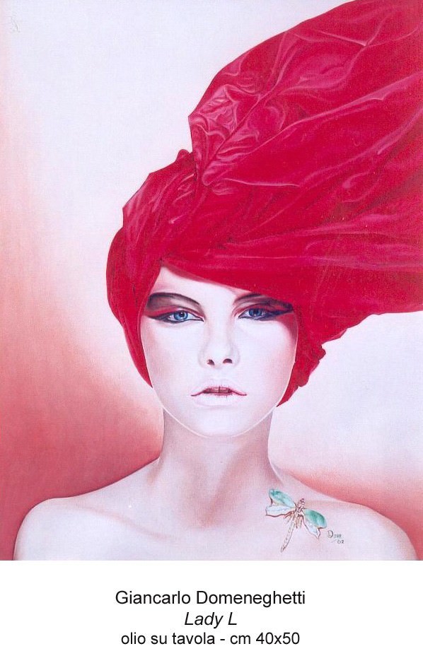 “Iperrealismo” scrive Accerboni “è un movimento nato all’inizio degli anni Settanta in America, quale diretto discendente della pop-art, e poi diffusosi dagli States in Europa. Ed è una parola densa di significati, che allude a un mondo altro da sé, ad una realtà condotta dall’iperbole di analisi, di precisione e di attenzione, verso un universo fascinoso e scintillante. In pittura la visione iperrealista accentua il tratto, il contrappunto tra luci ed ombre, spesso drammatizza il significato delle immagini, scivolando anche verso il lessico surreale. In tale filone si situa il gesto pittorico di Domeneghetti, artista nato a Novara da genitori veneti, ma muggesano e triestino d’adozione. Formatosi alla scuola di Egidio Roma per la copia dal vero e di La Pasquala per la prospettiva, l’autore ha sviluppato con grande perizia nel corso del tempo un illusionismo mimetico che tocca i limiti di un sapiente virtuosismo. Temi prediletti dell’artista” conclude Accerboni “sono la donna e i fiori, in particolare la rosa, nella cui rappresentazione Domeneghetti acuisce il fascino e il mistero insiti nella loro luminosa natura”.