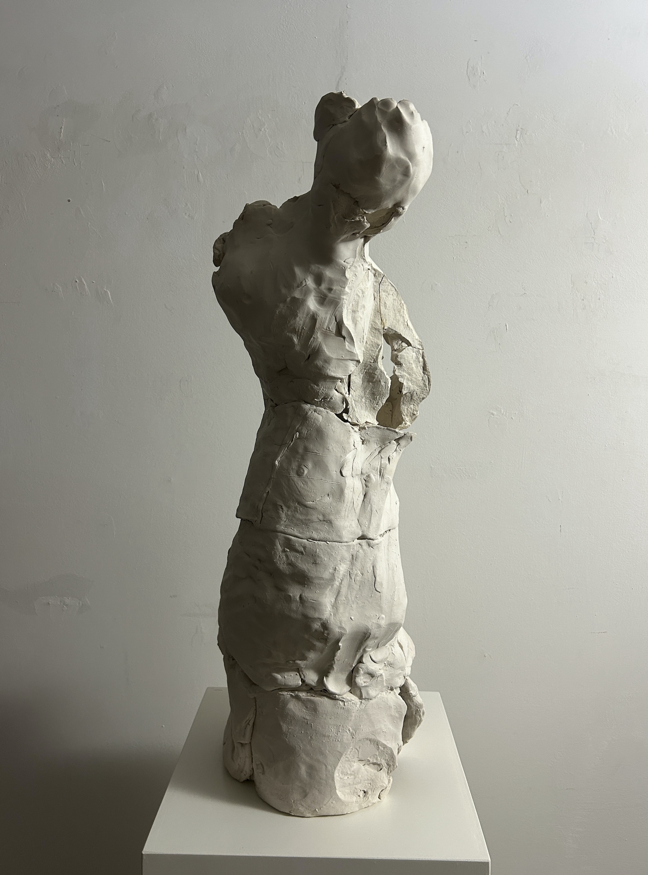 Sono due sculture in terracotta che si propongono come un richiamo ammirato alla Pietà Rondanini e a Medardo Rosso, con modellature e fratture provocate nella materia che le fanno sembrare incompiute. Entrambe le figure hanno il viso reclinato, sfuggente, intenzionalmente senza tratti significativi: una rivincita del corpo che, dandosi forma, riacquista la dimensione principale, occupando lo spazio in modo plastico.