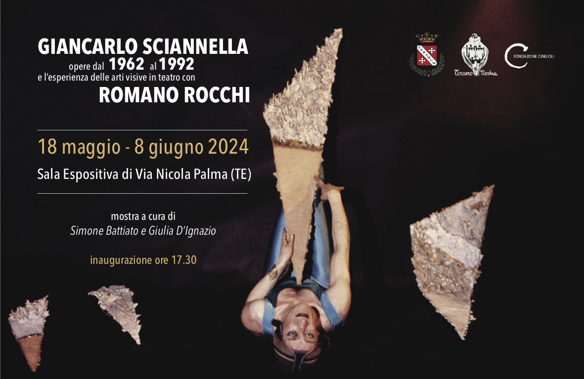 La poetica di Rocchi, che riflette sul concetto di “arte totale”, mira alla fusione sinestetica delle differenti espressioni artistiche (pittura, scultura, danza, musica e poesia) raggiungendo idealmente, attraverso il movimento e la gestualità corporea la “connessione” dei diversi linguaggi. A tal proposito, nel 1984, in occasione dello spettacolo teatrale Suicidio Rosa presso la “cantina” di sperimentazione teatrale Il Cielo di Roma, si manifesta la volontà del mimo di “teatralizzare” le arti visive in teatro; lo stesso, interagisce fisicamente con le opere di Sciannella, le Meteoriti (esposte nella sezione della mostra) trasformandosi così in “corpo artistico”. La collaborazione tra i due artisti proseguirà nel 1985 per lo spettacolo Incontro con Paul Klee, presso la Sala Borromini a Roma; nel 1988 in occasione dello spettacolo Mimus presso il teatro La MaMa di New York e l’anno successivo per lo spettacolo Mimus Centuntulus presso il Teatro Colosseo sempre a Roma. L’esposizione teramana documenta questo interessante sodalizio artistico attraverso le opere di Sciannella utilizzate da Rocchi nelle sue performances (Meteoriti, 1984 e Dardo, 1988), le locandine originali degli spettacoli e le foto di scena; si pone anche come focus d’indagine e approfondimento sulla figura di Romano Rocchi, artista tra i più originali della scena teatrale nazionale della post-avanguardia.