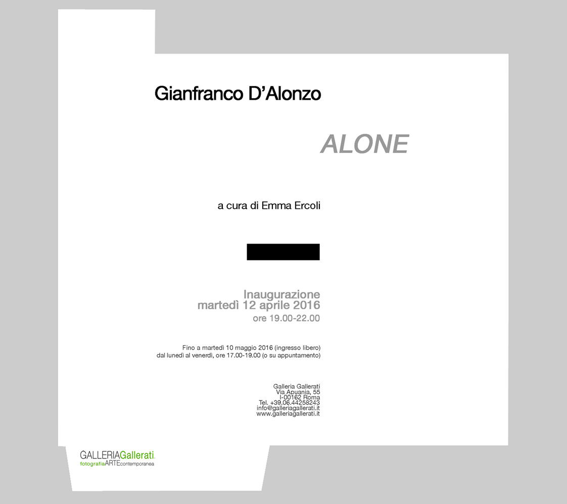 Si inaugura martedì 12 aprile 2016, alla Galleria Gallerati di Roma, Alone, una mostra personale di Gianfranco D’Alonzo a cura di Emma Ercoli.