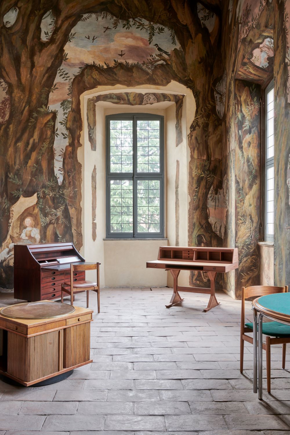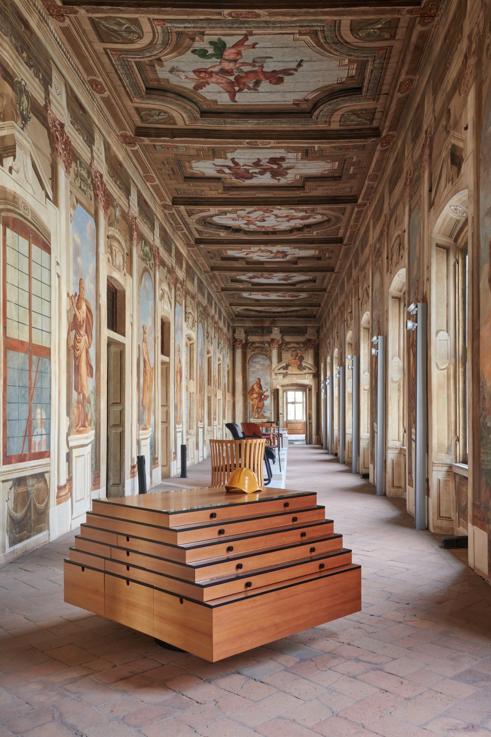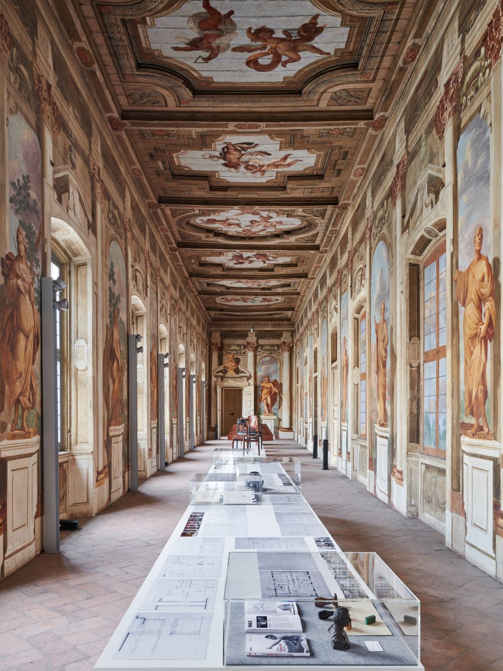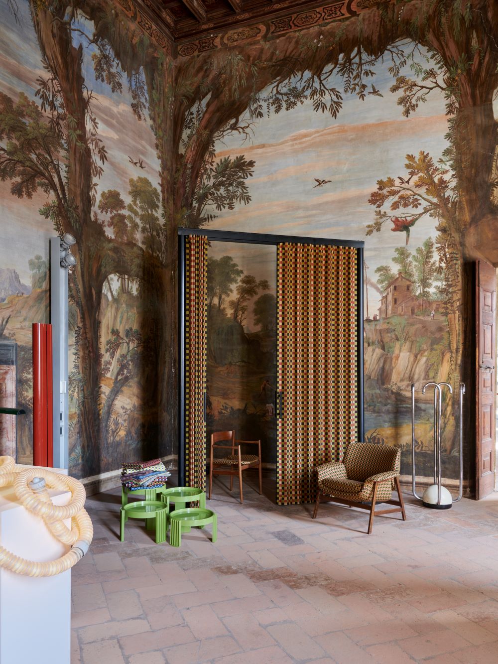 Nelle sale nobiliari del palazzo, opere, disegni, oggetti di archivio e vintage si affiancano a prodotti storici e nuovi nell’allestimento realizzato con il supporto di Ebanisteria Kora: pezzi di Acerbis, Cassina, CB2, Ceccotti Collezioni, Poltrona Frau e Tacchini, insieme a lampade di Arteluce, Artemide, FontanaArte, Gubi e Luci. La reinterpretazione dei canoni di Frattini si manifesta anche nelle porte tessili realizzate a quattro mani da Dooor e Torri Lana, con il contributo di Emanuela Frattini che, a partire dall’eredità stilistica del padre, ha dato vita a un