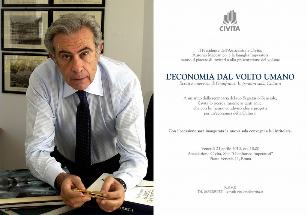Il primo incontro con Imperatori ha avuto luogo a via Barberini, nella iniziale sede dell’Associazione Civita dove ero stato invitato da Franco Lattanzi, mio indimenticabile amico e suo collaboratore, a partecipare ad una riunione dove dovevano essere discusse le attività future dell’Associazione sia con specifico riferimento al recupero di Civita di Bagnoregio che di natura più generale. Gianfranco Imperatori, come è ben noto a chi ha lavorato con lui, ci “inondò” di proposte su temi da affrontare e attività da realizzare. In quella riunione, anche per “arginare” quel fiume in piena, proposi l’idea dei Rapporti Civita come rapporti di approfondimento su aspetti specifici, anche se strategici, dei processi di tutela e valorizzazione delle risorse culturali. Nei giorni successivi, discutemmo nel suo ufficio al Mediocredito del Lazio una proposta più “formalizzata” dei temi da affrontare ed iniziò così la mia collaborazione con lui e con Civita. Gran parte dei temi che abbiamo selezionato nel 1989 sono stati alla base dei rapporti successivamente pubblicati dall’Associazione. Non ho più quel documento iniziale perché, conservato in uno di quei dischetti di vinile che rappresentavano allora una sorta di hard disc esterno e che sono diventati, per effetto dello sviluppo tecnologico, “illeggibili”.