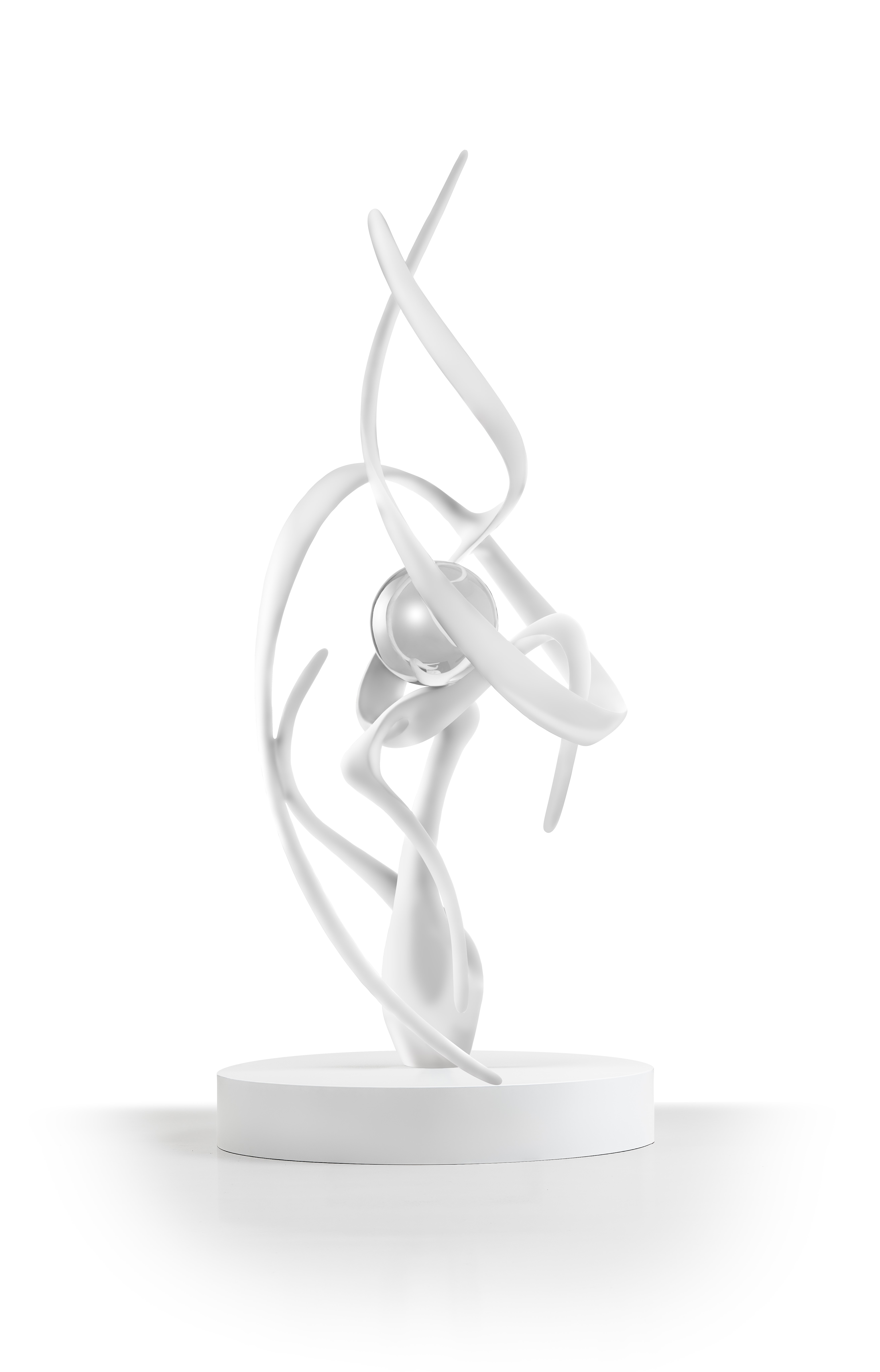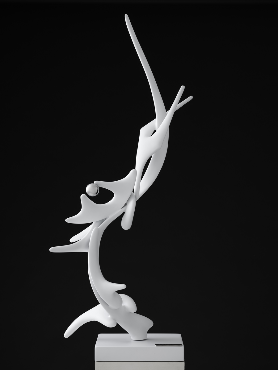 Risveglio, l’opera che dà il titolo alla mostra, è una scultura inedita alta quattro metri, che viene presentata in anteprima per l’occasione. Con il suo movimento a spirale tendente verso l’alto simboleggia un volo, un risveglio, un riscatto dell’essere umano che acquisisce la consapevolezza per liberarsi dai condizionamenti. Plasticamente, infatti, sono proprio due ali stilizzate che sostengono e sospingono verso l’alto una grande sfera lucente che simboleggia la coscienza.