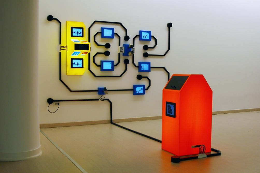 Sono microcosmi collegati da cavi nei quali, su piccoli display, si possono spiare momenti di vita quotidiana vissuti da pittogrammi segnaletici animati: i sintetici omini neri dalla testina tonda e dal corpo ridotto a poche linee si incontrano al supermercato, in coda alla cassa o intenti a spingere un carrello, ai giardinetti con i bambini, oppure, invecchiati, a passeggio per la città. Ma li si può anche ritrovare in situazioni “di ordinaria follia”, come l’omino che, dopo aver gettato ordinatamente i rifiuti nel cestino, decide – in un raptus di vandalismo – di dargli fuoco.