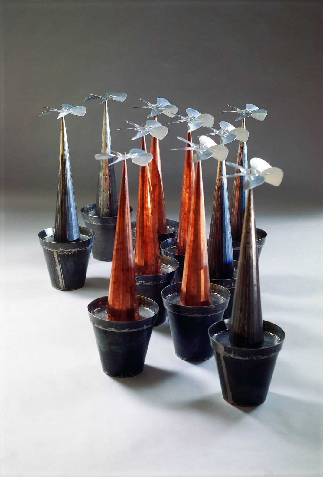 Le opere in esposizione fanno parte di un ciclo di lavori degli anni Novanta e Duemila, in cui l’elemento del Cono diventa l’emblema, il perno della costruzione, di forme minacciose e svettanti, nelle installazioni e pitture.
