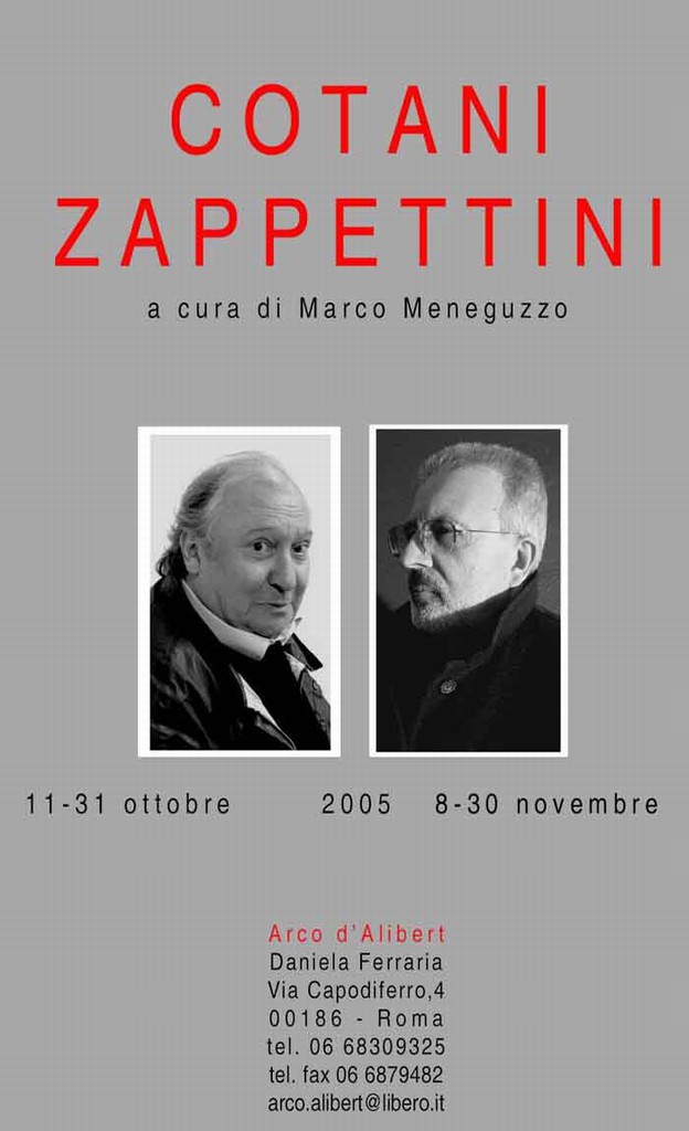 Con l’apertura della stagione espositiva l’Arco d’Alibert propone due artisti: PAOLO COTANI e GIANFRANCO ZAPPETTINI inaugurando le mostre in tempi diversi.