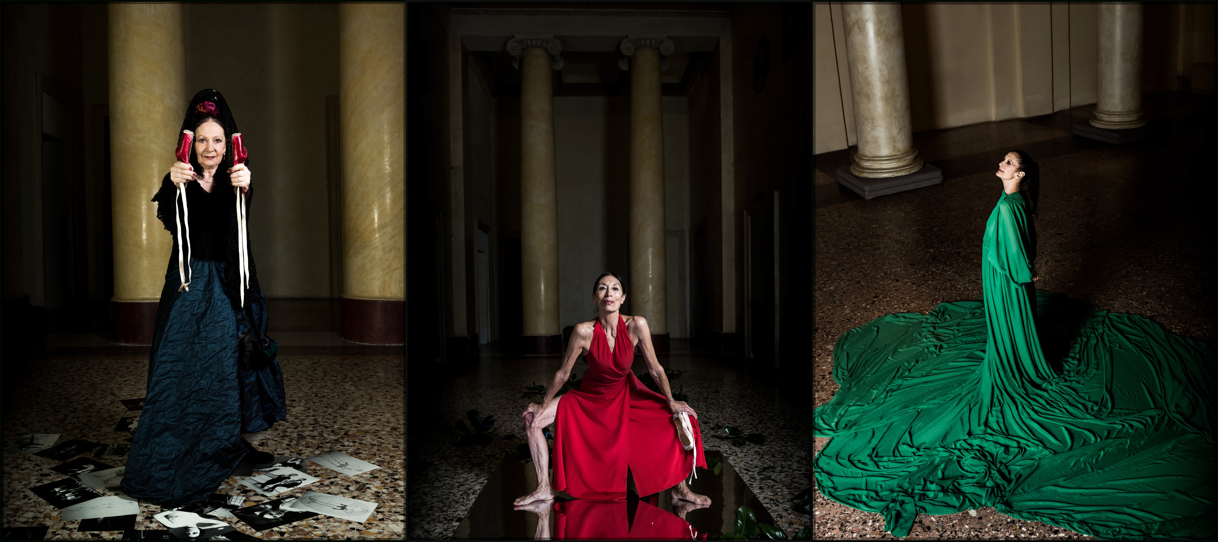La selezione di 18 scatti di Gianluca Balocco, realizzati con un apposito set fotografico nelle storiche sale di Palazzo Reale per ritrarre tre celebri ballerine di fama internazionale, sono il risultato di un lavoro in cui le tre donne emergono per la loro forza, esperienza e vigore nel corpo esile e flessuoso come un giunco, modellato dal tempo. Si tratta di un’opera concettuale in cui il vestito indossato viene considerato come elemento di collegamento fra la realtà e una dimensione astratta e assume un ruolo e un peso diverso e del tutto personale per ogni danzatrice. Aida Accolla, con creatività e ironia indossa abiti da lei ideati e realizzati, e con essi interpreta diversi ruoli, immedesimandosi in una pianta che attraversa le differenti stagioni; Carla Fracci indossa un vestito ideato per la mostra insieme all’artista, lungo 11 metri a indicare lo scorrere del tempo e di colore verde in sintonia con la natura; Luciana Savignano con costumi lisi e consumati usati nell’allenamento di una vita, viene ritratta come una guerriera samurai, fisica e vitale.