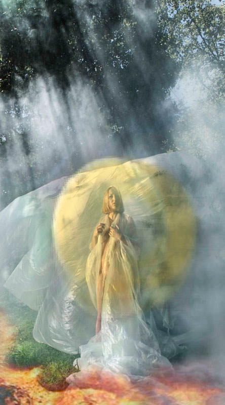 E così, corpi avvolti nella plastica in un giardino ideale, al tempo stesso conniventi e ostaggio del materiale, sembrano danzare insieme seppur limitati nel movimento, sono intrappolati, e nonostante ciò giocano e convivono con la plastica stessa, in un corto circuito paradossale simile, come meccanismo, alla sindrome di Stoccolma, in cui i sequestrati finiscono per affezionarsi e difendere i loro oppressori-sequestratori. Nella loro sembianza di umana deità, quei corpi vogliono ricordarci che qui, ora, in questo mondo, ci è data la possibilità di vivere, di esistere, e non solo di sopravvivere a noi stessi e ai nostri scarti; vogliono esortarci a una presa di coscienza maggiore che ci porti a reagire a quel “disturbo” diventando consumatori più responsabili.