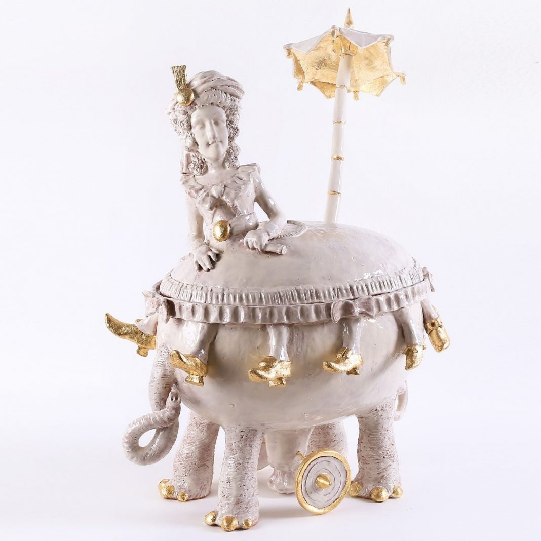 Il percorso si chiude con una sontuosa tavola apparecchiata per due coperti in cui pietanze e stoviglie prendono vita autonoma e diventano esseri bizzarri, in cui la terracotta rivestita in bianco e oro si finge, senza riuscire, porcellana di Capodimonte.