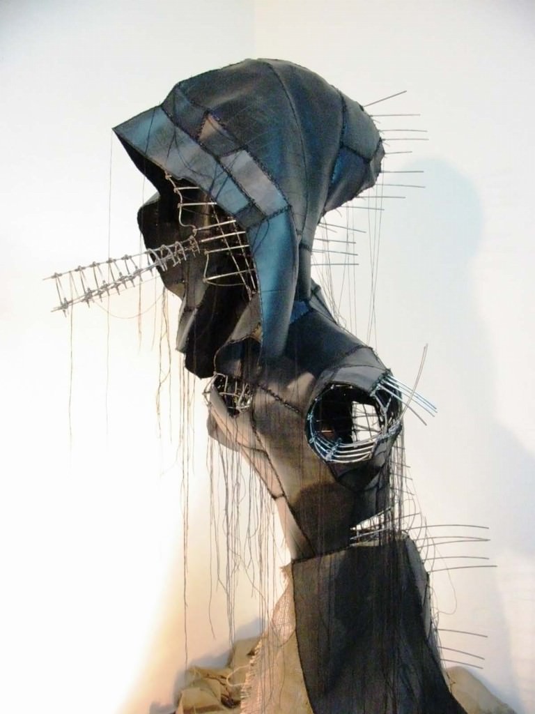 grandi sculture, installazioni e oggetti realizzati con intrecci di filo metallico e tessuti post-moderni ottenuti da pezzi di camere d’aria cuciti insieme