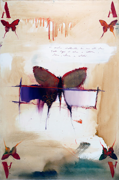 In questa serie di dipinti - inframmezzati di lettere e parole che segnano la scena dell’accadimento pittorico - Gianluca Motto si misura con un tema antichissimo e classico che, da sempre, è metafora di ciò che si trasforma e che è intrinsecamente fragile: la farfalla, simbolo della bellezza effimera e cangiante.