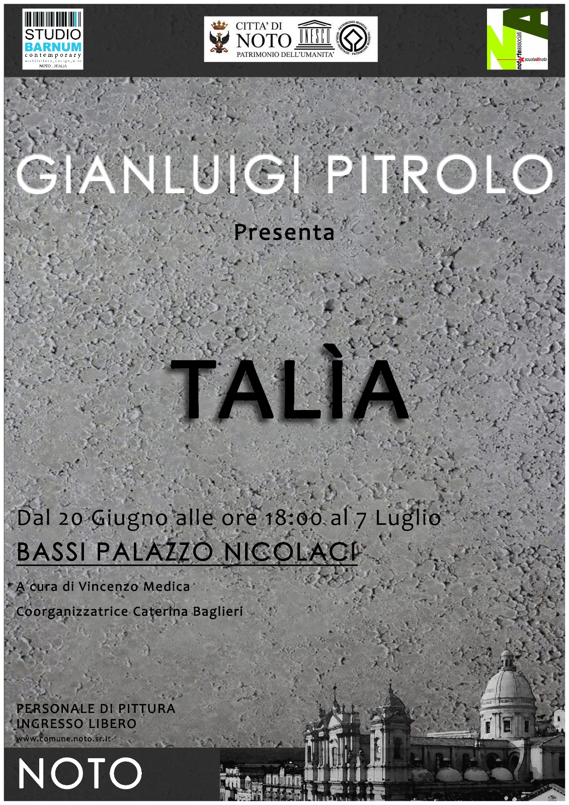 La straordinaria ars naturae di GIANLUIGI PITROLO, prenderà corpo nella sua personale di pittura “TALIA” e consterà di tre temi principali: il carrubo, la natura ed il mare, attraverso un percorso intimo tra colori e sensazioni intrisi, inevitabilmente, di amore e passione per l’arte, ma soprattutto per il territorio siciliano. Quella stessa arte che, per lui, non è mai stata mai un hobby a cui dedicare qualche fugace attimo, ma l'unico punto di fuga da una realtà che chiedeva e richiedeva altro.