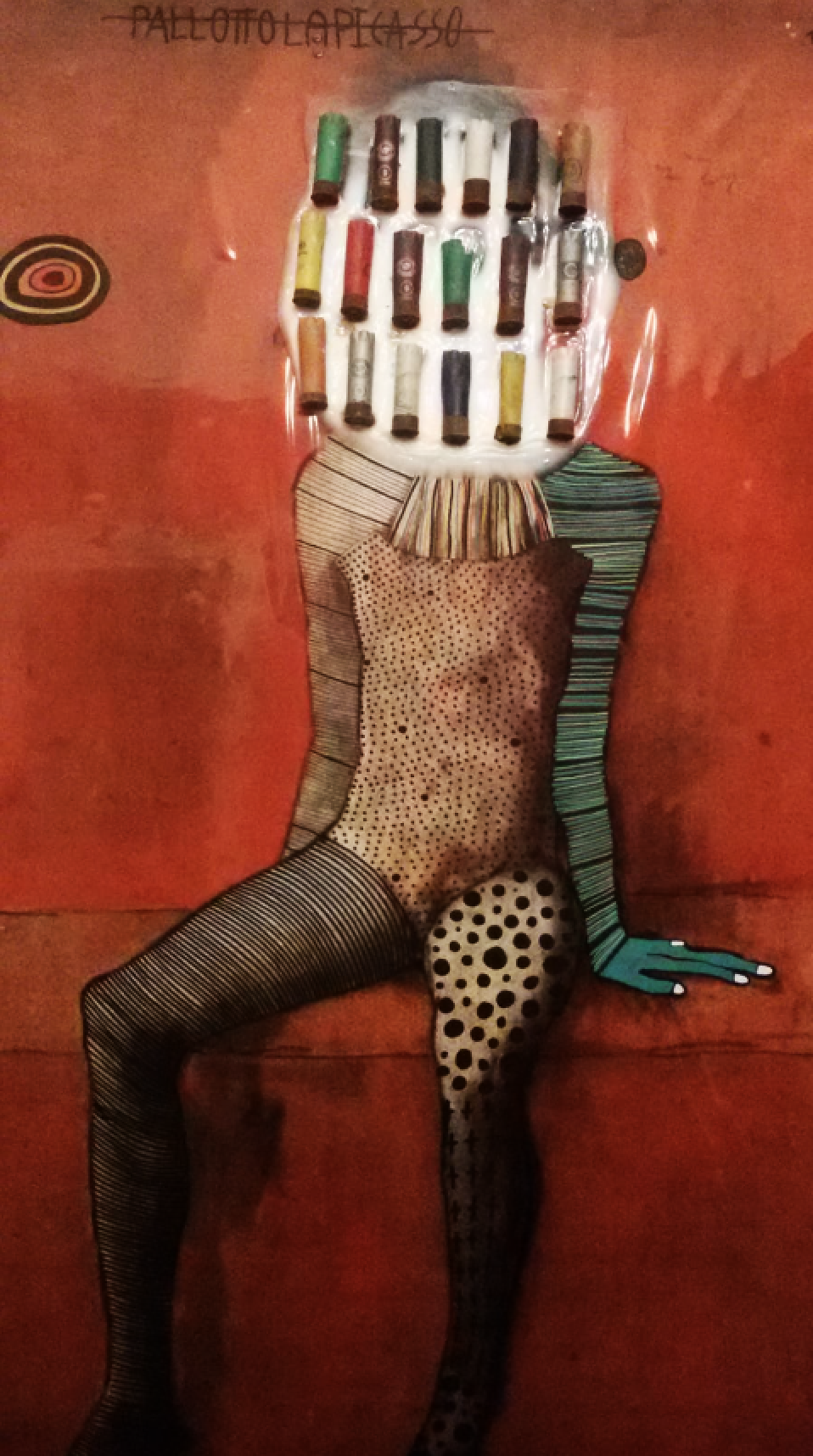 L’intera narrazione iconografica risulta adesso imprigionata sul fondo, al di là delle tubature sovrapposte al dipinto. Un altro orrore, un’altra manomissione della storia, quasi il tentativo di superare il dramma attraverso la strategia dello scherno, dello scarabocchio e della dissacrazione.
