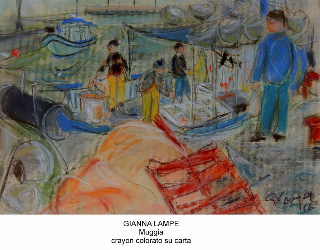 Nella quindicina di opere esposte, realizzate di recente quasi tutte con crayon colorati su carta, l’artista si esprime con una levità descrittiva che le consente di trasmettere al fruitore, con semplicità e attenzione, l’atmosfera e l’essenza dei luoghi più amati di Muggia: tra questi, la piazza del Duomo con il mercatino frizzante di colori e l’elegante casa veneta in calle Oberdan, la “timida” chiesetta di San Francesco e la nuova scacchiera cromatica di piazza Caliterna, il mercato dei pescatori, vivido di colori e gentile nei gesti dei personaggi e il molo delle illusioni, frequentato un tempo dai giovani innamorati, in cui la Lampe ripercorre con grazia attenta l’anima veneta di Muggia e il suo fascino.