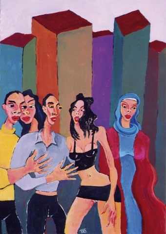 I protagonisti sono incastonati in città immaginarie, senza nome, sfondo silenzioso e anonimo costruito con linee nette e colori brillanti che danno vita a veri e propri ritratti, a volte di volti a tutti noti, colti come in uno scatto fotografico nella loro immobilità e fissità, sotto cieli bianchi, blu e rosa.