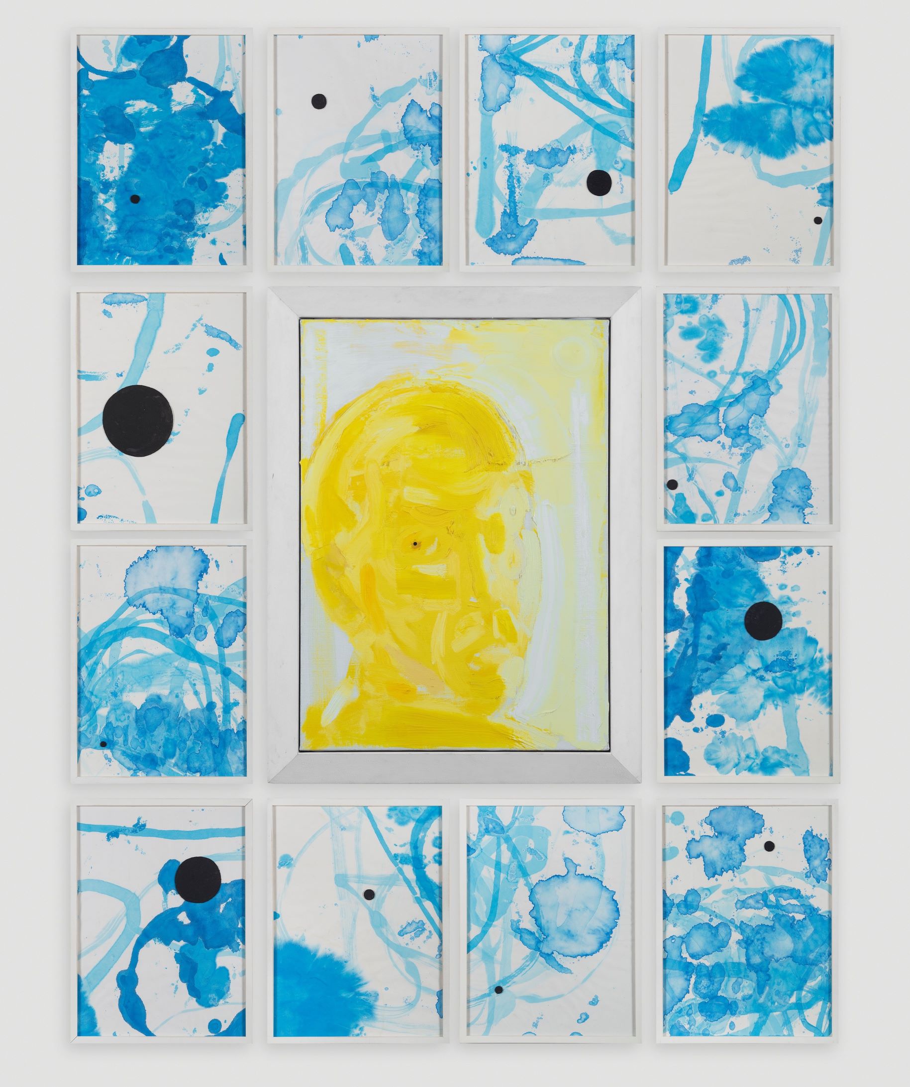 La mostra si articola in più ambienti. Il primo, ospita l’opera Tutto insieme, quasi un autoritratto in giallo con, segnato in nero, il centro dell’occhio che ci si rivolge. Il secondo raccoglie una serie di lavori sul tema del portare alla luce. L’ultimo, un ristretto numero di chine su carta.