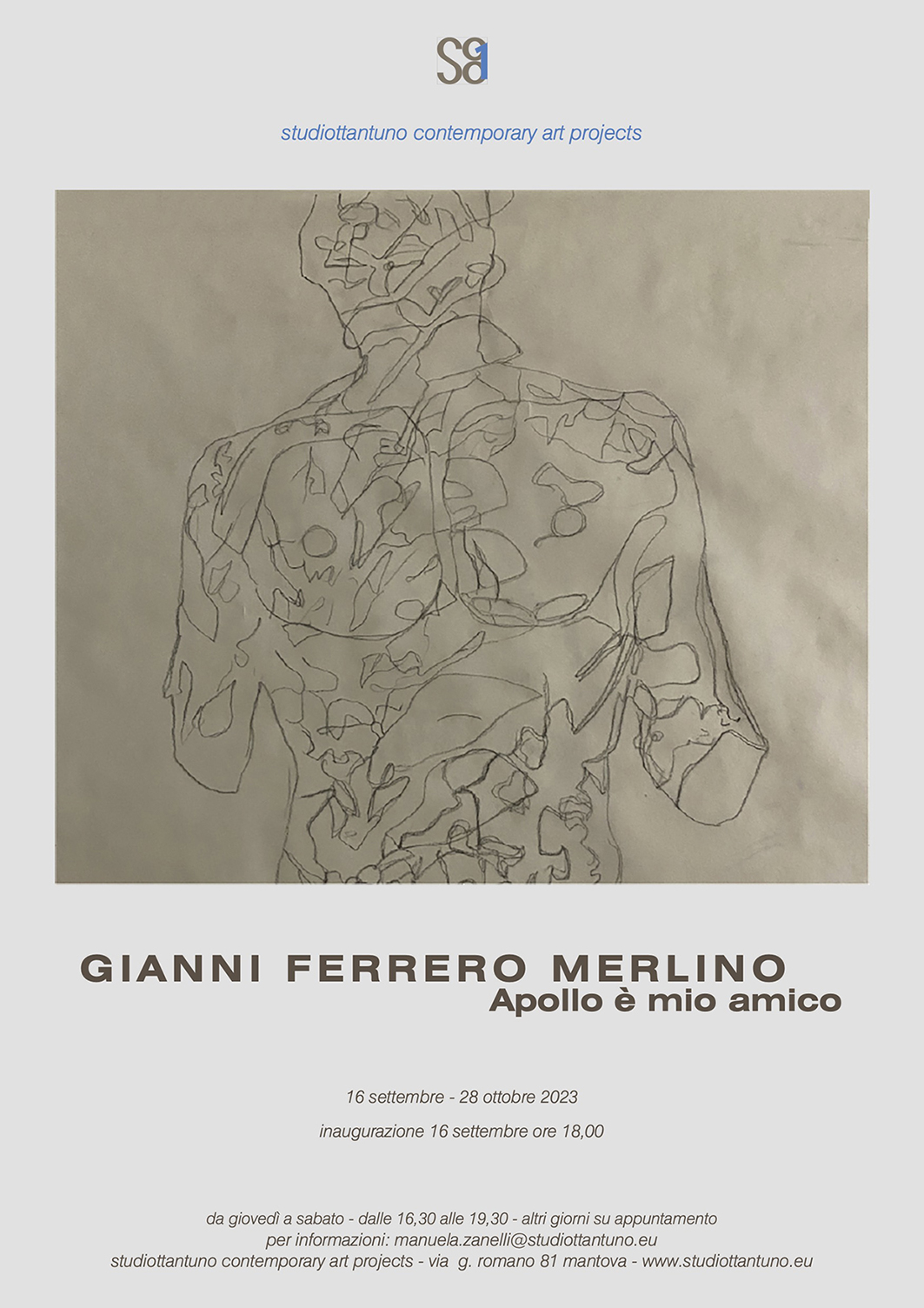 Il centro culturale Studiottantuno Contemporary Art Projects presenta la mostra "Apollo è mio amico" con le opere di Gianni Ferrero Merlino. In particolare, un progetto recente di disegno e pittura che ha valore di tappa processuale ed insieme di risultato di identità complessa per il carattere da una parte di un non finito dell'opera, dall'altra di forma installativa quindi deputata anche ad inserirsi in modo attivo nello spazio della galleria. Indagare il processo del vedere, della sua costruzione sembra essere sempre stato un punto fondamentale della ricerca dell'artista come interdipendenza di fattori psico-percettivi di varia natura che stanno sul confine di un tempo inafferrabile tra sensazione visiva e visione immaginativa, percezione e apparizione, presente e memoria. Per fare questo inizialmente Gianni Ferrero Merlino si è servito della fotografia come dispositivo per capire le implicazioni di come funziona il nostro vedere proprio mediante l'occhio fotografico e la sua proceduralità. Oggi, partendo dalla stessa suggestione fotografica dell’immagine latente delle cose che si forma attraverso la superficie sensibile esposta alla luce, arriva ad una sua visione materiale ed immateriale insieme che mantiene un tratto di imponderabile fenomenicità quasi “magica” attraverso il disegno e la pittura. L’artista sembra giungere ad un avvicinamento sempre più stretto con il processo del vedere che contempla dentro le maglie del suo deposito culturale anche il mito come espressione, egli dice, del "sensibile" da cui parte ogni nostro complesso contatto con il mondo in tutte le sue implicazioni e variabili esperienziali. Così Apollo non è solo riferimento culturale esterno nei suoi valori simbolici ma è il pretesto per parlarci di quel confine dell'apparizione dell’immagine tra mondo del precosciente e della presa di contatto con la realtà, già anticipato in nuce da alcuni lavori come Seraphita e Folding. Apollo come apparizione indica dunque non tanto una presenza fantasmatica ma alla fine una concretezza quasi fisica come tappa di un processo di presa di coscienza e di lento rimpossessarsi del corpo nella sua piena consapevolezza e come rispecchiamento dialogico di sé nelle cose del mondo che diventa necessariamente una sorta di unità inscindibile. L'operazione esplora il processo stesso del vedere nelle varie tappe del processo creativo tra annotazioni, disegno, pittura, installazione.