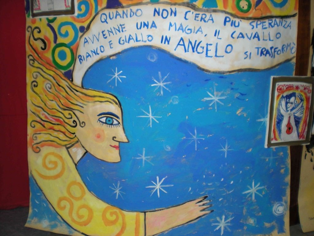 E’ uno stato d’animo in movimento. I personaggi del fiabesco possono anche apparire, ma non sono illustrati, descritti, sono solo tracce evanescenti di un racconto, di qualcosa che si muove che è vivo. Sono, insieme ai colori, alle fantasie, alle improvvisate mescolanze di segni, colori, ornamenti ecc., delle testimonianze del misterioso, del magico, dello straordinario che accompagna la vita. Dunque la fiaba e le fiabe, non come semplice “tema” da trattare o trattato, ma sono contenitori immaginari del tempo, della natura, del vissuto, icone concrete, pitturate, segnate, colorate di stupore e vitalità.