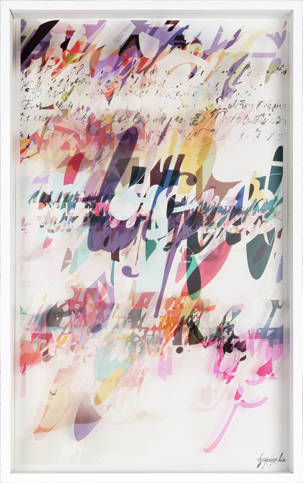 Nella lotta contro l'evanescenza delle nostre immagini e parole Gianni Gaggiani crea una sua originale tecnica, la Typomachia, che sembra voler fissare la fugacità dei pensieri dando sostanza al surreale. Attraverso un gioco di colori e trasparenze, con l’uso dei pastelli sulle trasparenti lastre di plexiglas, poi inserite in uno spazio tridimensionale, Gaggiani ci offre una visione caleidoscopica del mondo, invitandoci a esplorare una nuova dimensione. Attraverso la sovrapposizione dei piani bidimensionali, l’artista desidera aggirarne la piattezza, creando un dialogo tra loro per donare una nuova prospettiva di profondità a cui guardare, in una sorta di ribellione alla pagina piatta e bidimensionale. Il risultato è un caleidoscopico gioco di mescolanze di segni grafici e colori, perché come ci ricorda Laura Imai Messina «parlare di colore è un atto di immaginazione», un’operazione che richiede di accettare la sua natura mai definita e irregolare. I sogni, come i colori, sono frammenti di fantasia che prendono forma solo nella nostra mente. Per coglierli, bisogna prima sognarli, abbracciando la loro essenza impalpabile e lasciando che ci trasportino oltre i confini del reale. Le Typomachie di Gaggiani - come lui ci racconta - sono tessute di «caratteri e glifi, atomi delle parole che danno senso alla nostra vita», sono filamenti sottili intrecciati, dove il reale e l’immaginario si fondono in un abbraccio di forze misteriose. Sono gli echi di parole ascoltate, lette e scritte, segni di una scrittura nata da una mente che ha immagazzinato molti libri, perché non è un caso che i titoli delle sue opere prendano spunto dai grandi classici della letteratura mondiale: Decameron, Lolita Moby-DicK, Memorie di Adriano… La libertà cresce nella conoscenza, ed è così che i colori dell'inconscio permettono alle paure di danzare con i desideri e che le speranze si mescolano per generare nuovi spazi. Le opere di Gaggiani sono ambienti in cui i colori e le parole si trasformano e mutano fluendo come in un mare di possibilità infinite.
