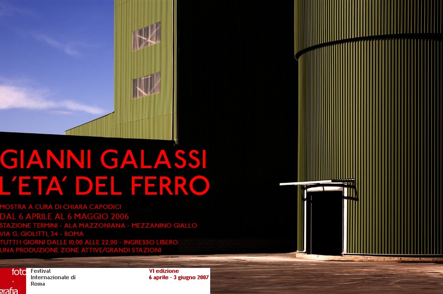 Dopo la mostra ExtraLight, recentemente conclusasi al Museo Nazionale di Palazzo Venezia, a Roma, GIANNI GALASSI è ospite del Festival Internazionale della Fotografia di Roma, diretto da Marco Delogu, con la personale L'ETA' DEL FERRO, dal 6 aprile al 6 maggio presso il Mezzanino Giallo, prestigioso spazio espositivo all'interno dell'Ala Mazzoniana della Stazione Termini. In quindici immagini a colori 60x90, Galassi esplora il paesaggio industriale del territorio di Montalto di Castro, tra i resti archeologici della centrale nucleare e le geometrie di un moderno cementificio. La mostra è a cura di Chiara Capodici e prodotta da Zone Attive e Grandi Stazioni.