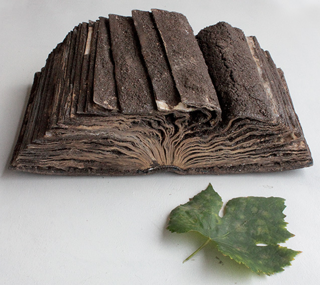 Lavorare la terra non è solo poetico, prima, e da sempre, è un duro lavoro. Il progresso ha contribuito a rendere il lavoro nei campi meno faticoso che in passato, e oggi nei supermercati troviamo frutta e ortaggi puliti, senza difetti, provenienti da ogni parte del mondo, in ogni stagione. Di pari passo, senza clamore, sta scomparendo il mondo contadino dal quale più o meno tutti proveniamo, dove c’era dialogo tra uomo e la natura, ma soprattutto c’era sapienza, e una cultura silenziosa e concreta scritta su pagine di terra che parlano di un tempo non lontano, nel quale eravamo ricchi senza saperlo. Al centro dell’installazione una tavola con piatti, bicchieri, posate di terra, e il libro/scultura Lezione della Terra. l’installazione è in progress, i visitatori, per tutta la durata della mostra, possono contribuire con un sacchetto di terra del proprio luogo di origine, paese, terreno, località.