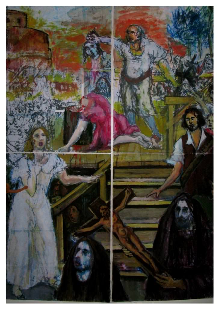 Il polittico di “Beatrice Cenci”, di 10 pannelli suddivisi in tre ‘quadri‘, ancora in corso di esecuzione durante l’esposizione, in una sorta di rotocalco pittorico-lirico espressionista, rievoca i momenti cruciali della vicenda: il primo l’uccisione nella notte del padre- padrone, il secondo il trasporto in una torrida giornata estiva di Beatrice e della matrigna Lucrezia verso il luogo dell’esecuzione ed infine il terzo la esecuzione della condanna, immagine tragica e sconvolgente in cui campeggia una Beatrice terrorizzata ma dignitosa nel salire i gradini del palco.
