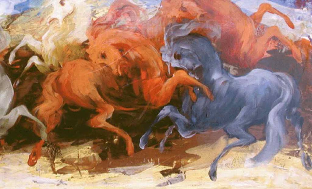 A tenere uniti i cicli c’è quello dei cavalli. I cavalli sono dappertutto, a rendere possente ed epica la pittura di Testa, a far si che la visionarietà dei suoi colori, l’inquietudine esistenziale che lo avvicina a De Chirico non sia statica, di attesa, di contemplazione, ma sia furente e appassionata. Il galoppo di cento eserciti, un terremoto, l’esplosione di un vulcano, in una parola l’apocalisse perpetua o quella che Giordano Bruno definisce per l’individuo l’eroico furore.