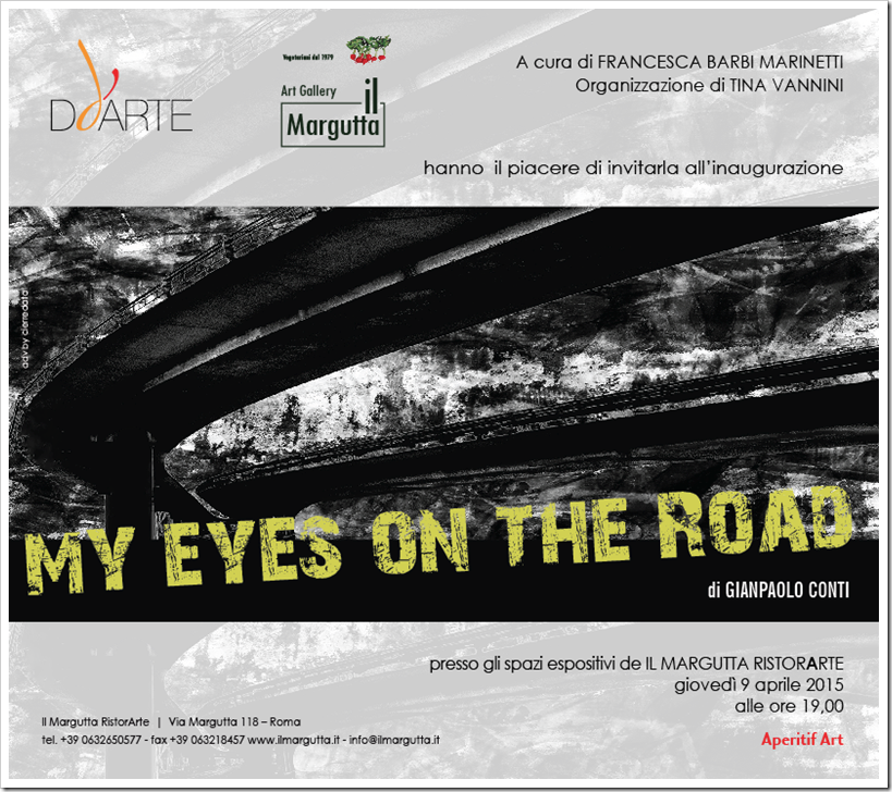Sarà inaugurata oggi alle ore 19:00 presso gli spazi espositivi de Il Margutta RistorArte, in via Margutta 118 a Roma, la mostra personale di Gianpaolo Conti “My Eyes on the Road”, a cura di Francesca Barbi Marinetti e organizzata da Tina Vannini. Trentaquattro le opere in mostra, che sarà visitabile sino al 16 maggio ad ingresso libero.