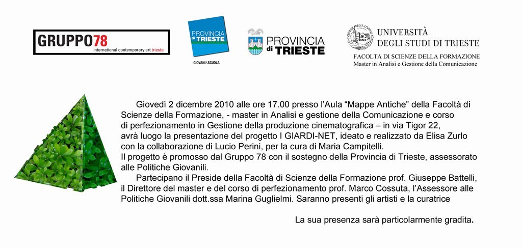 Giovedì 2 dicembre alle ore 17.00 presso l’aula “Mappe Antiche” della Facoltà di Scienze della Formazione dell’Università agli Studi di Trieste, in via Tigor 22, il corso di master in Analisi e gestione della comunicazione ed il corso di perfezionamento in Gestione della produzione cinematografica, diretti dal prof. MARCO COSSUTTA, organizzano la presentazione dei lavori realizzati nell’ambito del progetto “I GIARDI-NET o stanze aperte al racconto”, promosso dal GRUPPO 78 in collaborazione con la Provincia di Trieste (Assessorato alle politiche giovanili).