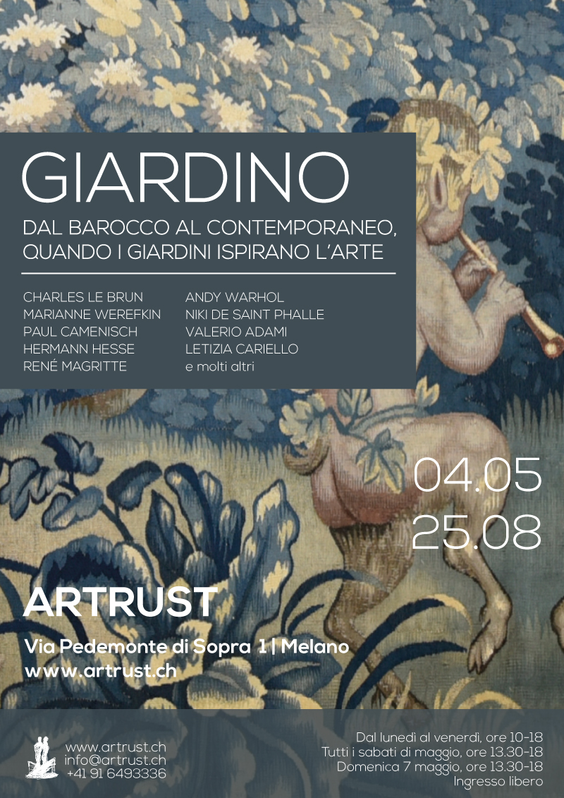 Tornano ad animarsi gli spazi espositivi di Artrust a Melano con la mostra “Giardino”, allestita dal 4 maggio fino al 25 agosto, in via Pedemonte di Sopra 1. L’esposizione esplora il tema giardino nell’arte, ripercorrendo la storia di un soggetto che ha ispirato artisti di ogni epoca e stile. In mostra più di 30 opere di oltre 18 artisti che coprono un arco temporale che va dal 1600 a oggi: Charles Le Brun, Marianne Werefkin, Hermann Hesse, Rene Magritte, Andy Warhol, Niki de Saint Phalle, Valerio Adami, Letizia Cariello e molti altri.