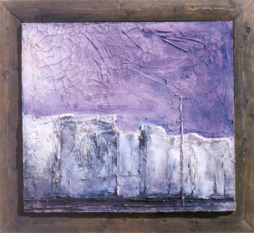 Il suo linguaggio, nel tempo sprovincializzato, ovvero universalizzato, ha assunto così pro-prie cifre stilistiche d’ordine materico e segnico, senza perdere completamente i richiami figurali. Soprattutto si distingue la singolare costruzione plastica delle opere -pur conservando la forma di quadri a parete -, grazie all’apporto di polvere di tufo, calce, vinavil ed ecoline su grezze tele di juta, che giunge persino al calco diretto di elementi naturali o manufatti.