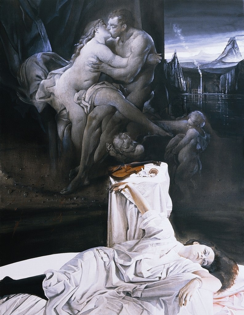 Scrive Parmiggiani, curatore del testo in catalogo: “Sembrano metafore dell’esistenza, delle sue soavi illusioni iniziali e delle sue amare verità ultime, le opere di Gigino Falconi. S’offrono spesso al nostro sguardo, i suoi dipinti, attraverso il movimento lento, pervaso di un antico languore, di una figura in primo piano che se ne sta davanti a noi, sul palcoscenico del teatro della vita – pare, in verità, la posizione raffigurata da Falconi, il frammento di una lunga immobilità, una sorta di paralisi dell’agire, come se chi se ne sta di fronte a noi non volesse abbandonare il bozzolo del tempo in cui è racchiuso, e temesse di avventurarsi nel tempo “altro” che s’avanza, e che peraltro s’annuncia pieno di sfide e insidie. Nello stesso tempo, la figura che a noi si mostra sembra volerci invitare, con la grazia seducente di un corpo che dà profondità all’immagine e magneticamente attira il nostro sguardo, ad abbandonare il nostro mondo abituale, per inoltrarci nella rappresentazione di cui lei è, insieme, protagonista e passiva spettatrice, per diventare anche noi attori, o supini, silenziosi astanti, di un altrove che, procedendo verso il fondo del dipinto, si rivela sempre più enigmatico, talvolta inquietante e sinistramente allusivo.”