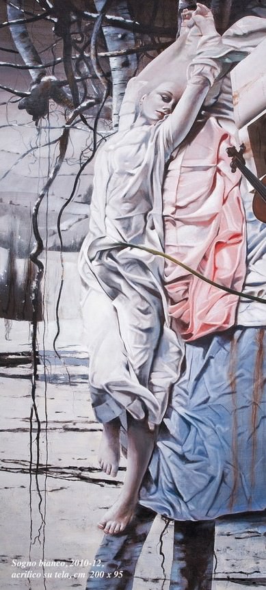 “In Falconi, l’appagamento esausto, la dimenticanza di sé, proprie di chi ancora sta uscendo dal sonno o dall’atto d’amore, paiono presto negati da uno spirito melanconico, talvolta tragico, sempre romantico, che s’affida a un paesaggio che, mentre rivela il suo splendore e il suo incanto, inevitabilmente fa pensare al tempo in cui tutto ciò sarà scomparso, inghiottito da una nemesi misteriosa che sentiamo aleggiare. Emblematici di questa malinconia inestirpabile, di questo senso della fine, sono gli alberi di Falconi: i tronchi e i rami sono spogli, come se fossimo dentro un tardo autunno o un inverno perenni, e spesso rimano con gli alberi delle navi; sovente l’artista pare raffigurare piante con un’architettura contorta e tormentata, come il salice piangente con i suoi rami che si fanno fili sottili, avvolgenti e inesorabilmente tesi a terra – immagine intrisa di immaginario romantico, di un senso di resa. Potremmo ricorrere, per definire le opere di Falconi, a una delle espressioni più felicemente poetiche di Edgar Allan Poe: “Un sogno in un sogno”. Sono, le sue figure, anche quando la loro carne ci affascina e accende il nostro desiderio, evanescenti, fantasmi evocati alla vita, ma che presto torneranno a dissolversi. Sentiamo di essere dentro un sogno, una rêverie estenuata o nitidamente spettrale, o presi dentro un ricordo, che, modificato dall’immaginazione, ha abbandonato i territori della realtà per farsi pura fantasia. C’è sempre, in Falconi, l’idea simbolista di una fuga dalla realtà che non può che collocarsi entro i territori della visione, una trasfigurazione del corpo e della natura in ciò che essi potrebbero essere in un tempo altro, verso cui tendono ma che forse mai conseguiranno. Spira, in Falconi, una fortissima tensione al viaggio verso l’ignoto, un desiderio d’altrove che si fa pittura, carne della rappresentazione. Non cela, l’artista, questa pulsione, ma pare volerla consegnare a simboli espliciti”.