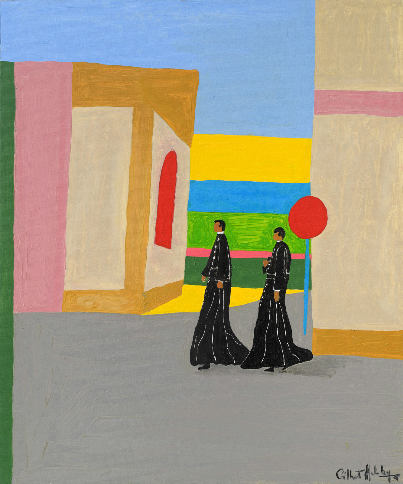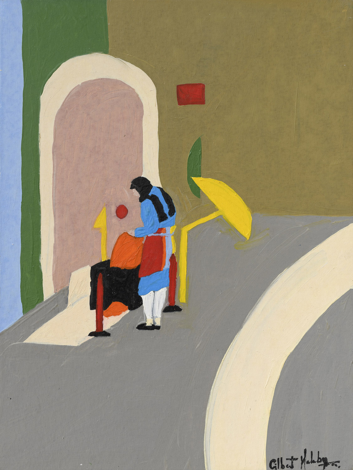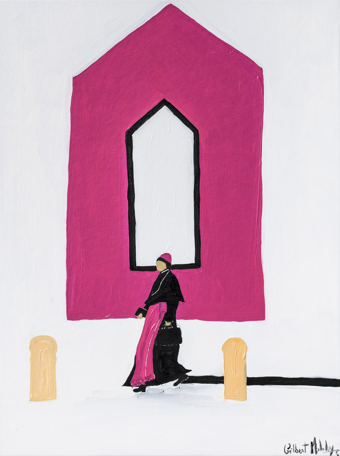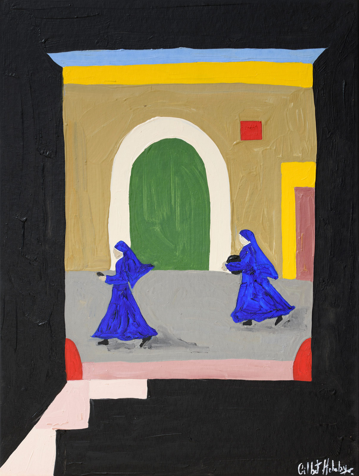 Nelle tele 'romane' di Gilbert appaiono personaggi senza volti, tutti compresi nei movimenti dei corpi e delle loro vesti agitate dall'aria del mattino, sagome di colore che si cristallizzano sulle tele di lino. L'artista esce fuori dal suo studio, tuffandosi nelle strade del centro, e voracemente, munito di telefonino, realizza brevi video là dove il suo occhio viene chiamato: sono le persone, o meglio alcuni personaggi specifici, che catalizzano l'attenzione di Halaby, che colleziona un grande numero di 'slow motions' in cui vediamo scorrere a piedi, decisamente a 'zonzo', preti, cardinali, suore, barboni, ma anche artisti, tutti prima o poi consapevoli di essere catturati in brevi video a colori. Da questo materiale di immagini in movimento l'artista seleziona dei fermo immagine, ne studia le numerose angolature, da cui emerge costantemente l'architettura come tessuto narrativo forte e chiaro, che stabilisce nuove regole del gioco delle parti tra tempo presente e tempo passato [...].