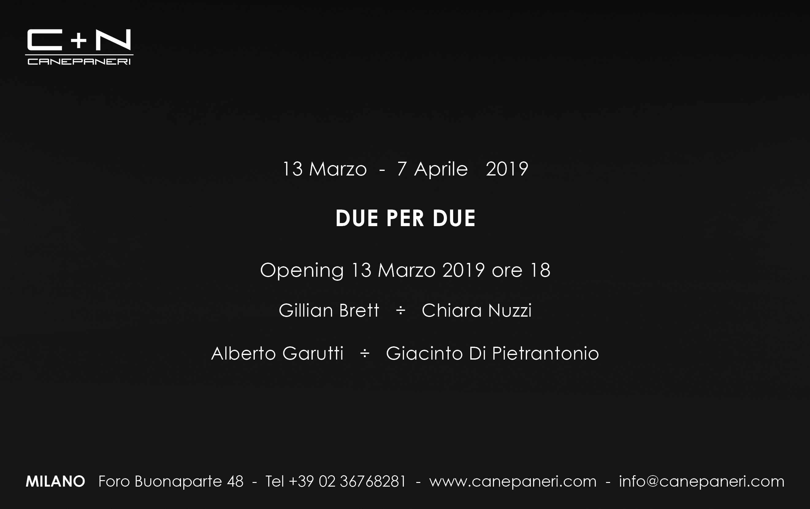 La galleria C+N Canepaneri è lieta di presentare DUE PER DUE, primo appuntamento di un progetto espositivo dove due artisti sono presentati da due diversi curatori: Gillian Brett da Chiara Nuzzi e Alberto Garutti da Giacinto Di Pietrantonio.