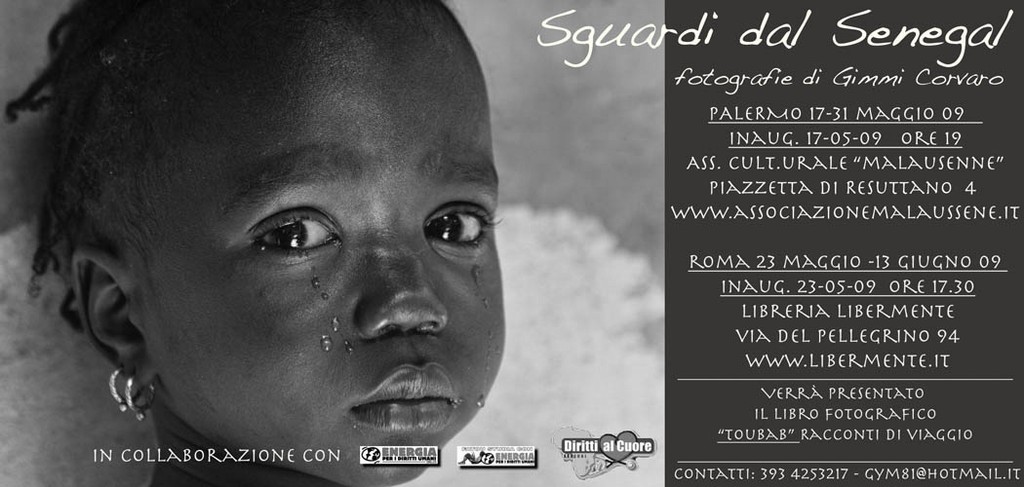 Gimmi Corvaro presenta “Sguardi dal Senegal”, mostra fotografica su un viaggio di volontariato effettuato in Senegal a gennaio di quest’anno con l’associazione “Diritti Al Cuore”. Durante la prima missione sanitaria del 2009 in cui sono stati visitati quasi 800 bambini, l’autore partecipa sia all’attività di volontariato che come fotografo. Durante la mostra verrà proiettato il filmato delle missioni e presentato il libro fotografico “Toubab racconti di viaggio”.