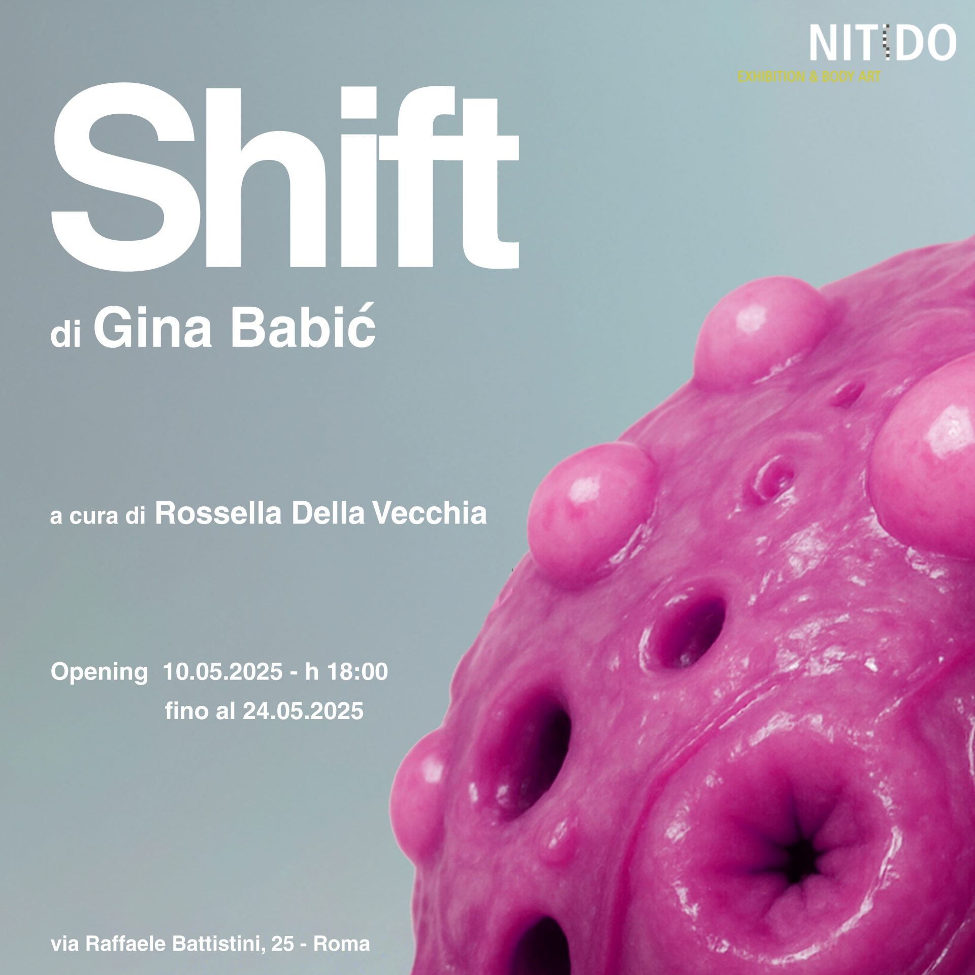 SHIFT (Shaping identities from transformation) di Gina Babić (Teramo, 1995) si inserisce nel calendario della NITIDO-Exhibition & Body Art, in quanto realtà romana dedita alla contaminazione del concetto di “corpo”, fagocitata dalla sperimentazione di artisti emergenti e da una ricerca curatoriale indipendente. È questo un progetto espositivo che invita ad entrare in un universo scultoreo che si fa dispositivo di scarto e di scavo nell’anatomia fisica ed emotiva dell’individuo.