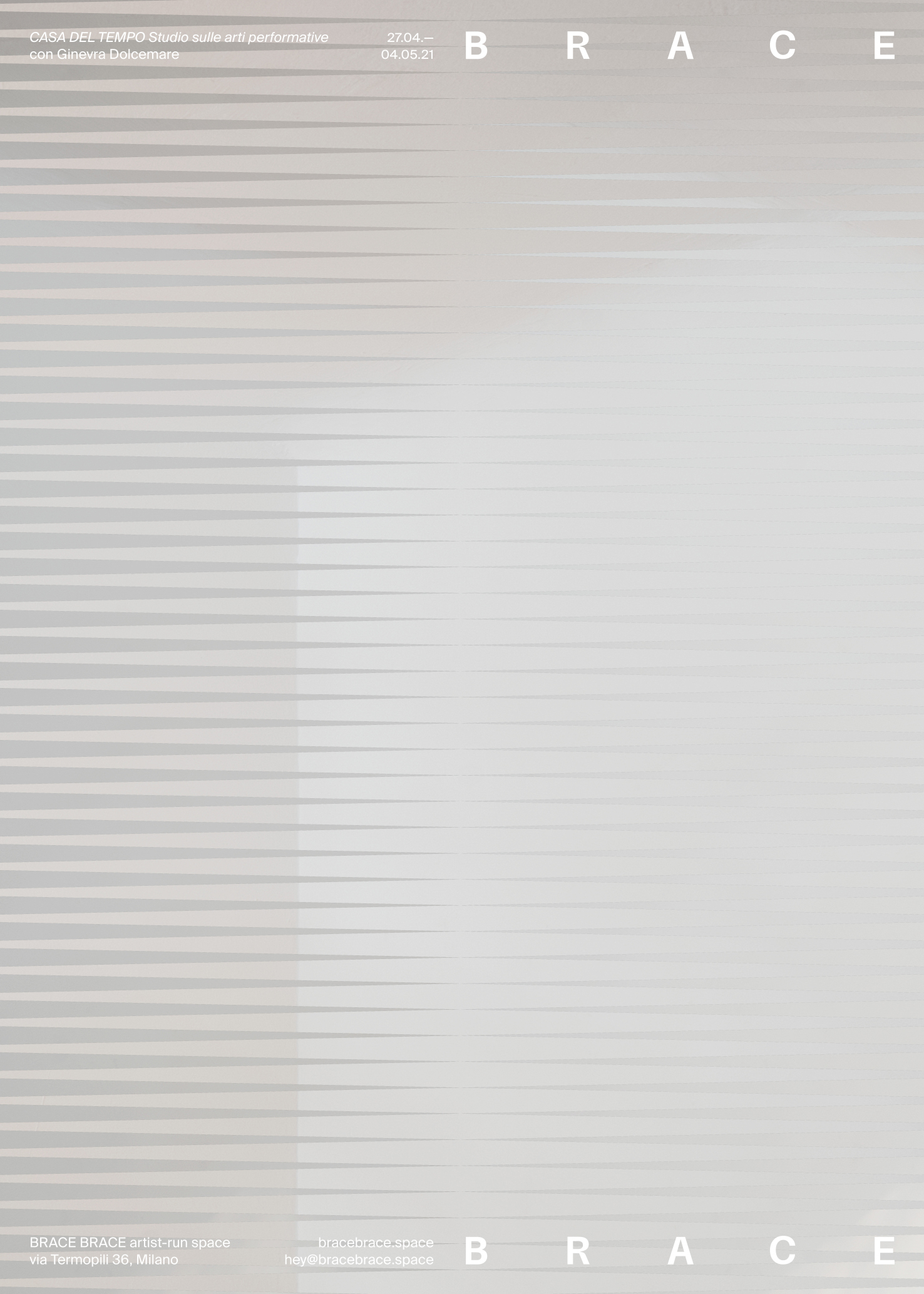 BRACE BRACE è lieta di presentare CASA DEL TEMPO - studio sulle arti performative, una rassegna che si pone l’obiettivo di approfondire teorie e visioni sulle pratiche performative contemporanee tramite il lavoro di artisti, studiosi ed istituzioni.