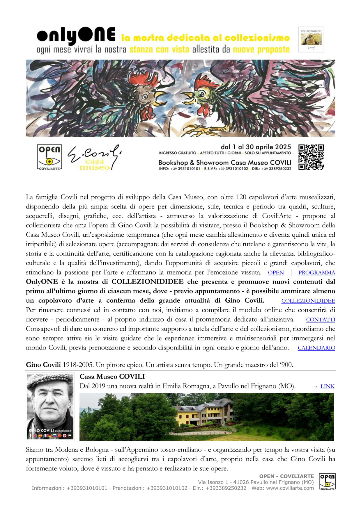 OnlyONE è la mostra di Collezionididee che presenta e promuove nuovi contenuti dal primo all’ultimo giorno di ciascun mese, dove – previo appuntamento – è possibile ammirare almeno un capolavoro d’arte a conferma della grande attualità di Gino Covili.