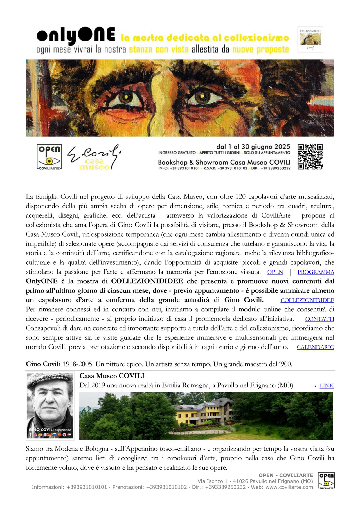 OnlyONE è la mostra di Collezionididee che presenta e promuove nuovi contenuti dal primo all’ultimo giorno di ciascun mese, dove – previo appuntamento – è possibile ammirare almeno un capolavoro d’arte a conferma della grande attualità di Gino Covili.