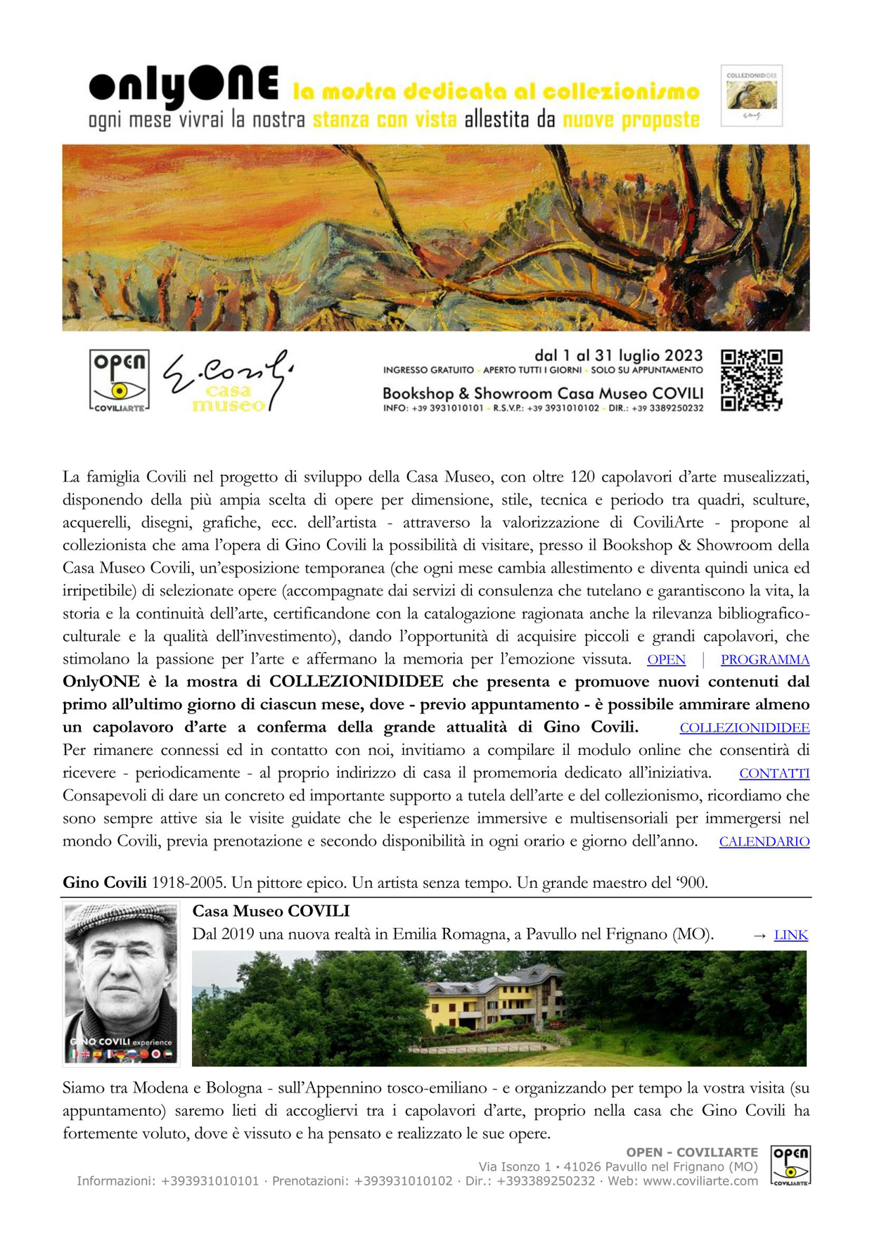 OnlyONE è la mostra di Collezionididee che presenta e promuove nuovi contenuti dal primo all’ultimo giorno di ciascun mese, dove – previo appuntamento – è possibile ammirare almeno un capolavoro d’arte a conferma della grande attualità di Gino Covili.