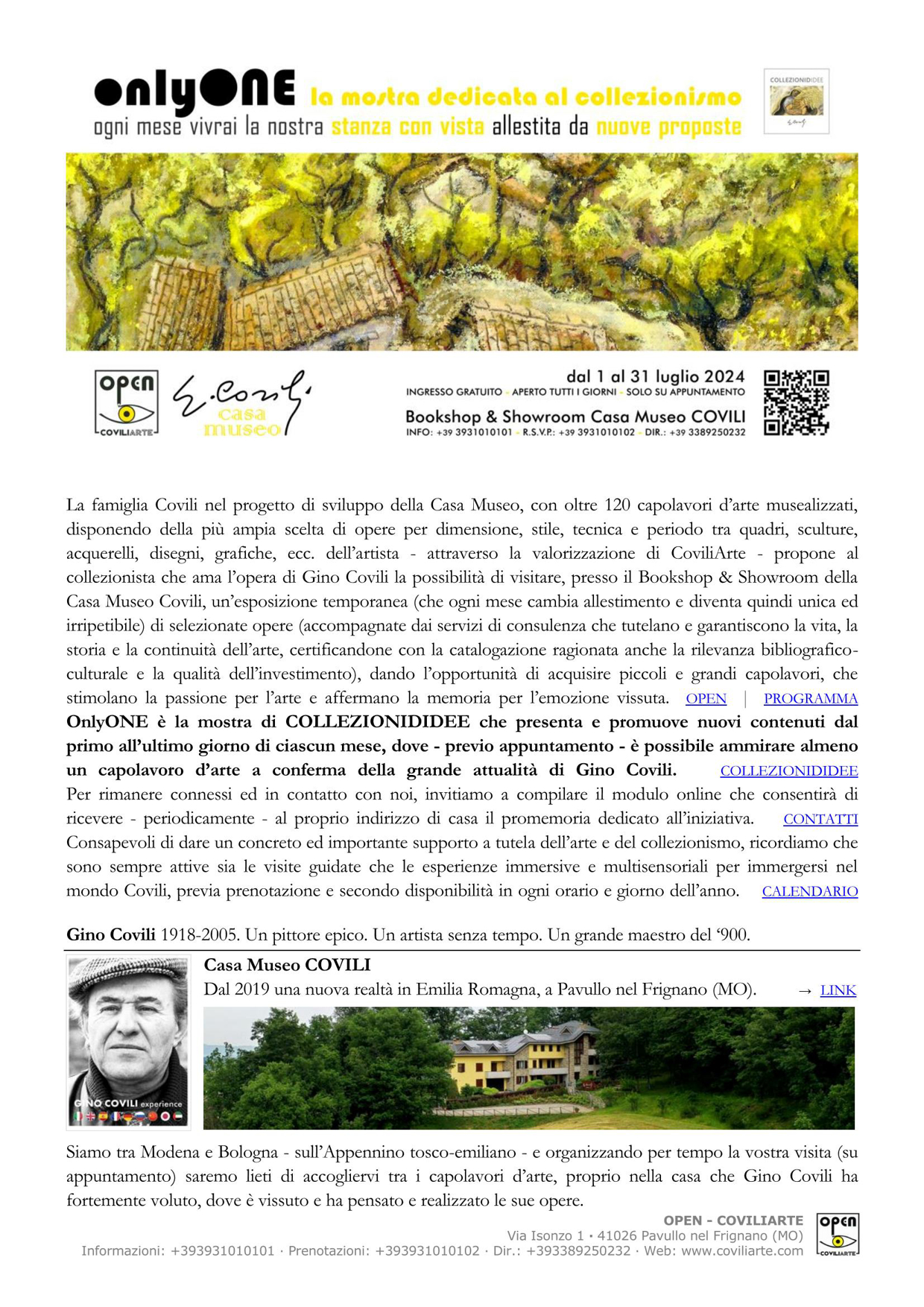 OnlyONE è la mostra di Collezionididee che presenta e promuove nuovi contenuti dal primo all’ultimo giorno di ciascun mese, dove – previo appuntamento – è possibile ammirare almeno un capolavoro d’arte a conferma della grande attualità di Gino Covili.