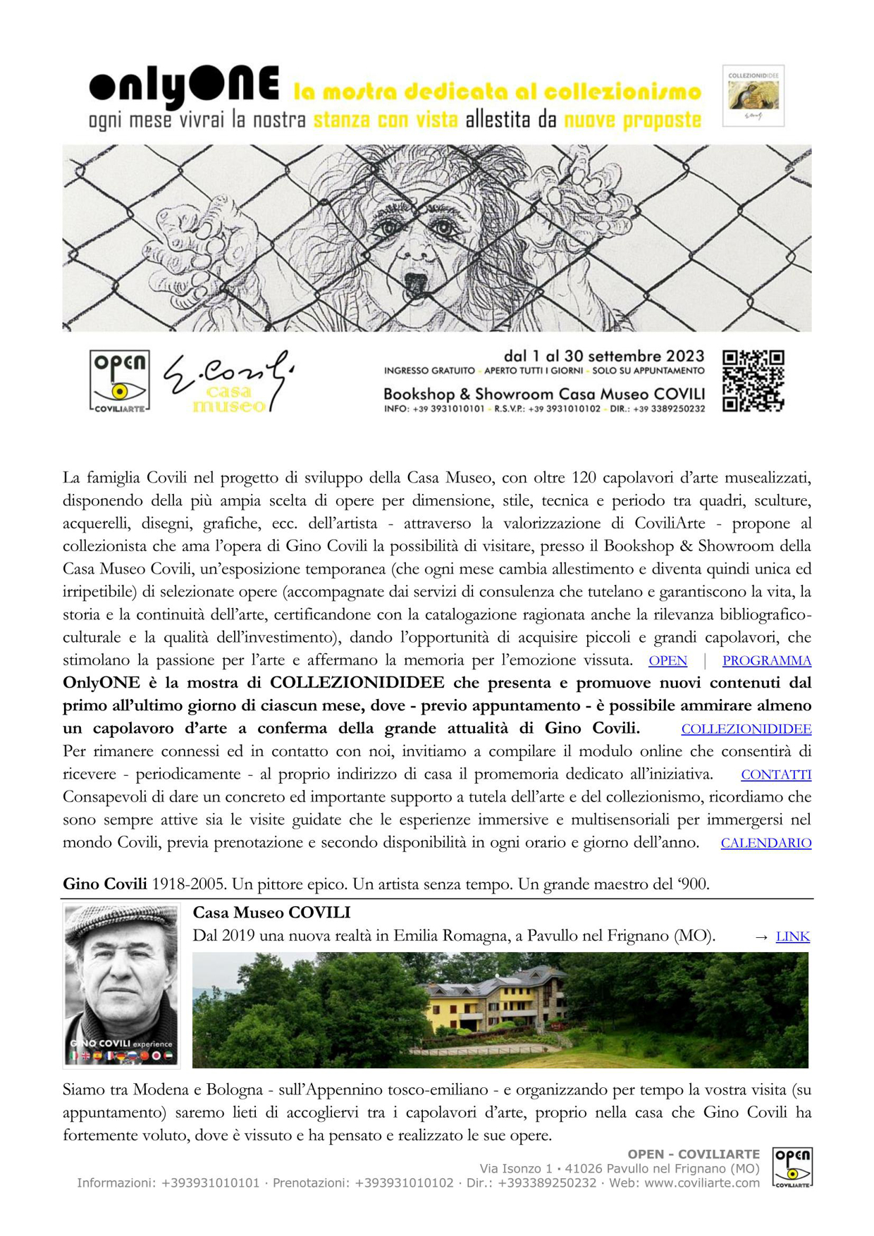 OnlyONE è la mostra di Collezionididee che presenta e promuove nuovi contenuti dal primo all’ultimo giorno di ciascun mese, dove – previo appuntamento – è possibile ammirare almeno un capolavoro d’arte a conferma della grande attualità di Gino Covili.