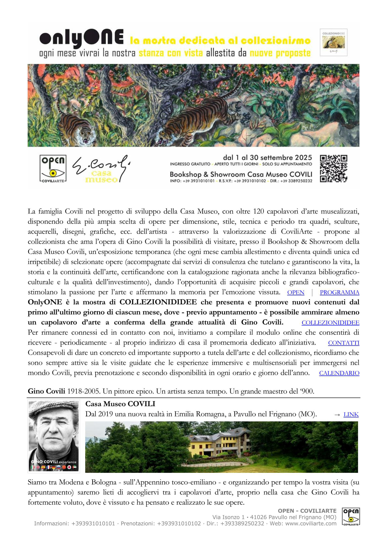 OnlyONE è la mostra di Collezionididee che presenta e promuove nuovi contenuti dal primo all’ultimo giorno di ciascun mese, dove – previo appuntamento – è possibile ammirare almeno un capolavoro d’arte a conferma della grande attualità di Gino Covili.