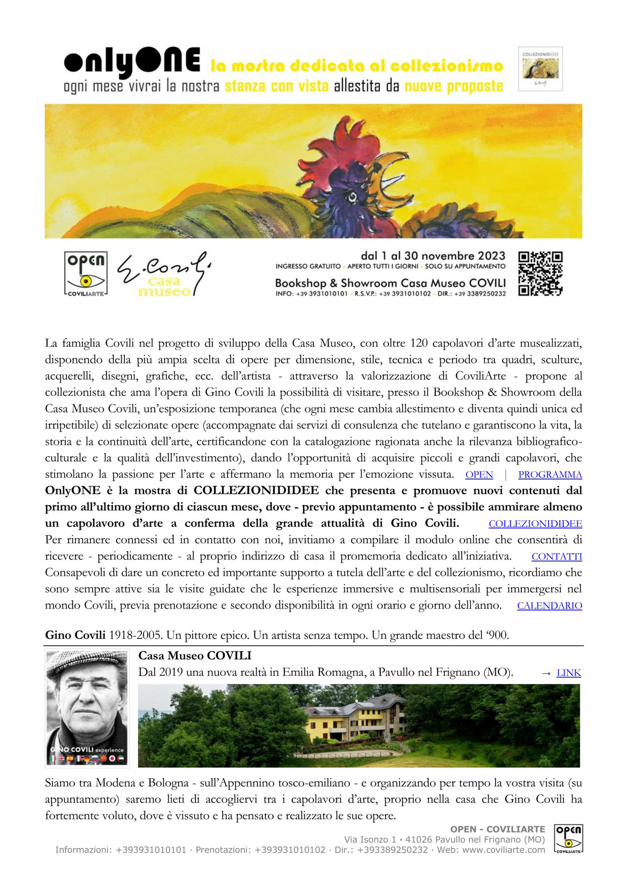 OnlyONE è la mostra di Collezionididee che presenta e promuove nuovi contenuti dal primo all’ultimo giorno di ciascun mese, dove – previo appuntamento – è possibile ammirare almeno un capolavoro d’arte a conferma della grande attualità di Gino Covili.