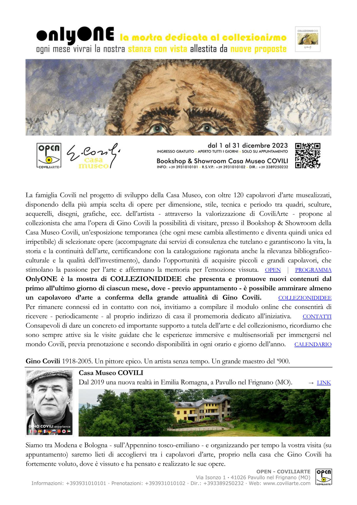 OnlyONE è la mostra di Collezionididee che presenta e promuove nuovi contenuti dal primo all’ultimo giorno di ciascun mese, dove – previo appuntamento – è possibile ammirare almeno un capolavoro d’arte a conferma della grande attualità di Gino Covili.